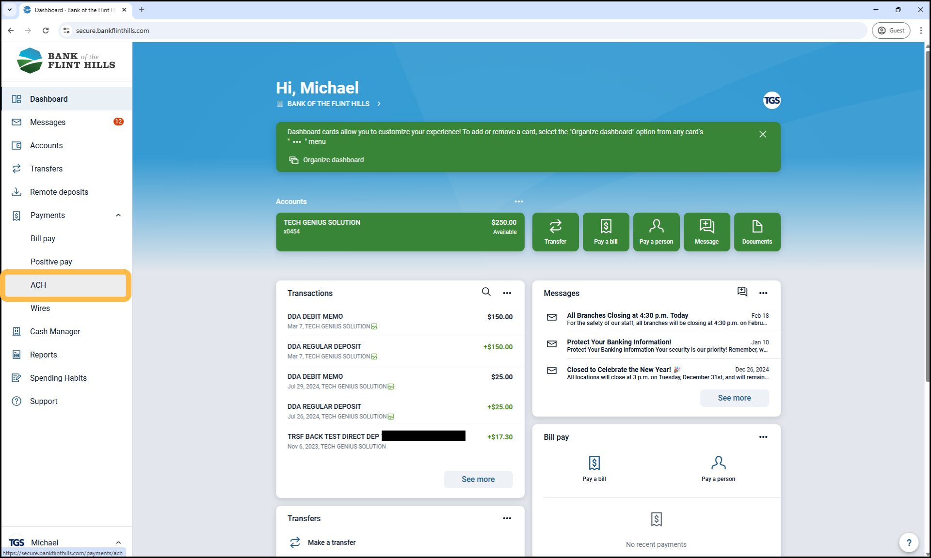 From the dashboard, select the 'Payments' drop-down menu, then choose 'ACH'.