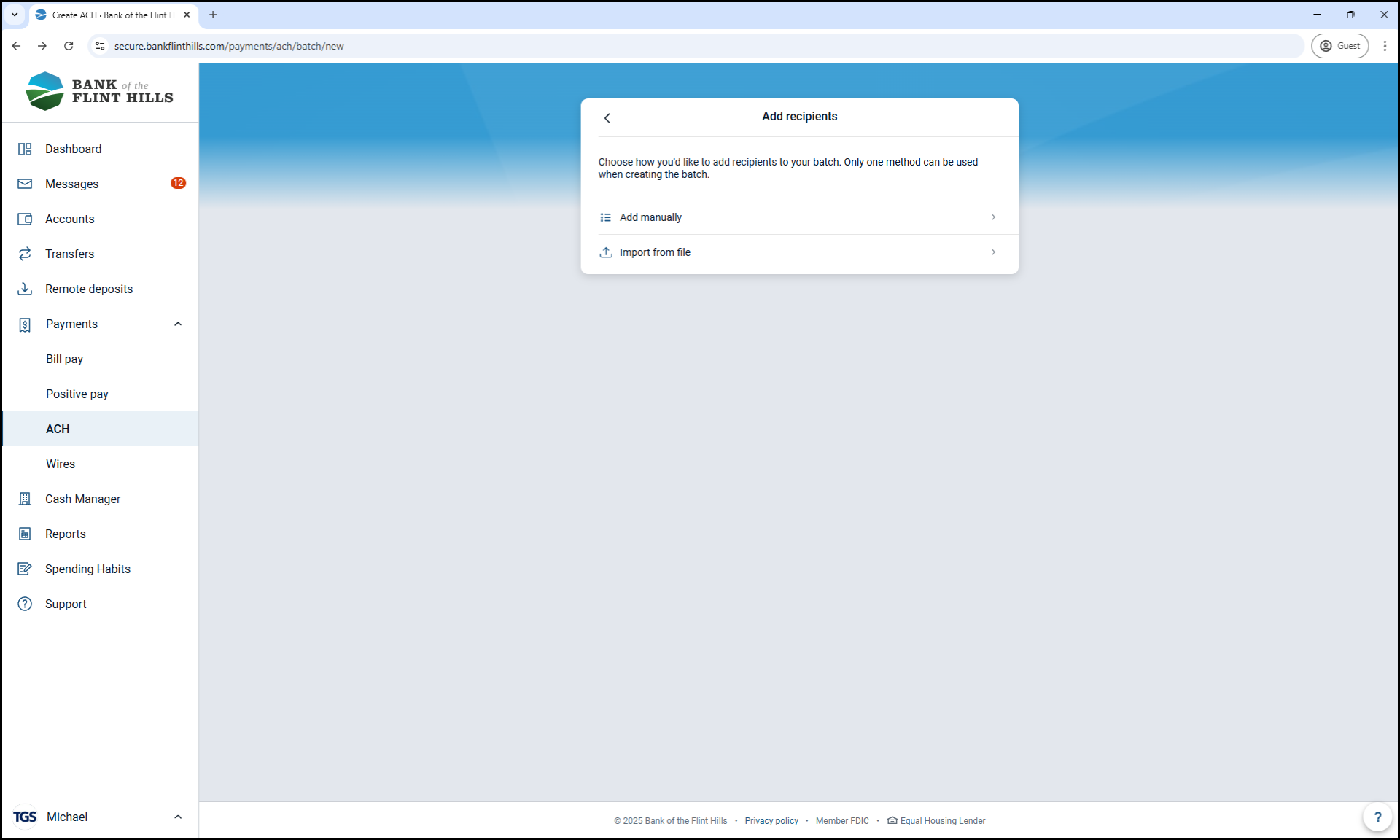 There are two ways to add recipients to your batch. If you have a NACHA file created by another system, you may choose 'Import from file' to complete this step. Otherwise, select 'Add Manually' to input your batch recipients.