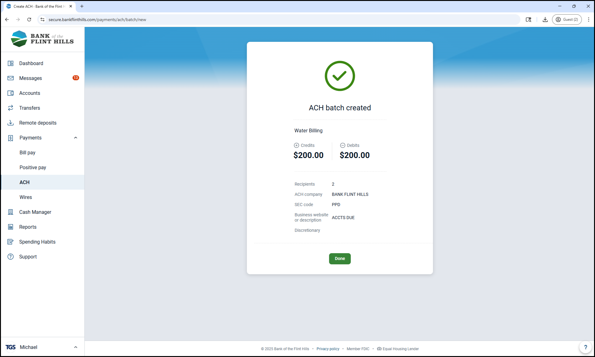 This saves your batch and adds it to your ACH batch list for future use or initiation.