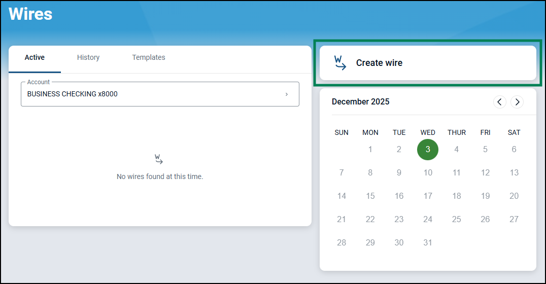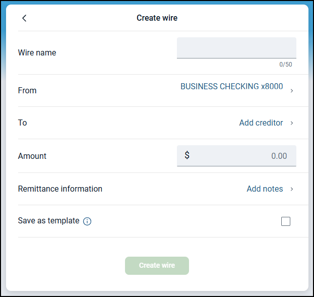 Save as template - Choose the "Save as template" checkbox if you would like to send a wire to the same recipient multiple times in the future. The recipient details will be saved in the wire template. Wires that are saved as templates will remain in the templates list on the wires dashboard after initiation. Wires that are not saved as templates will move to the history list once processed and cannot be edited afterwards.