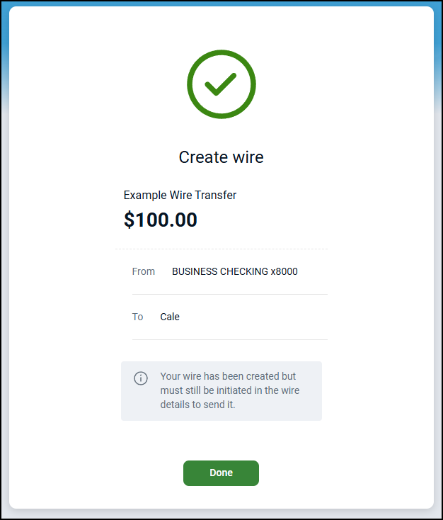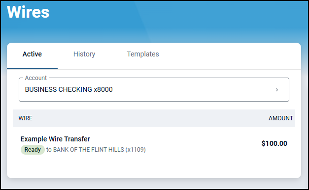After you successfully create a wire, the Wire success page displays, and the newly created wire displays at the top of the Active list of wires. The wire will also be in the Ready status.