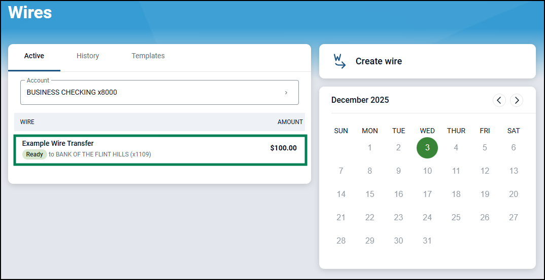 To initiate a wire, select the wire with a Ready status from the Active list.