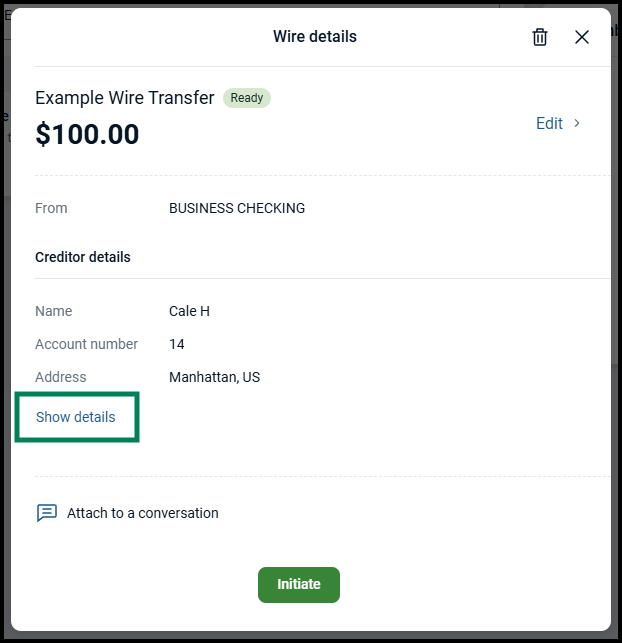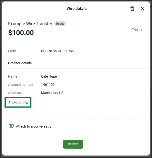 The wire details screen will display with the ability for you to edit, delete or initiate the wire.