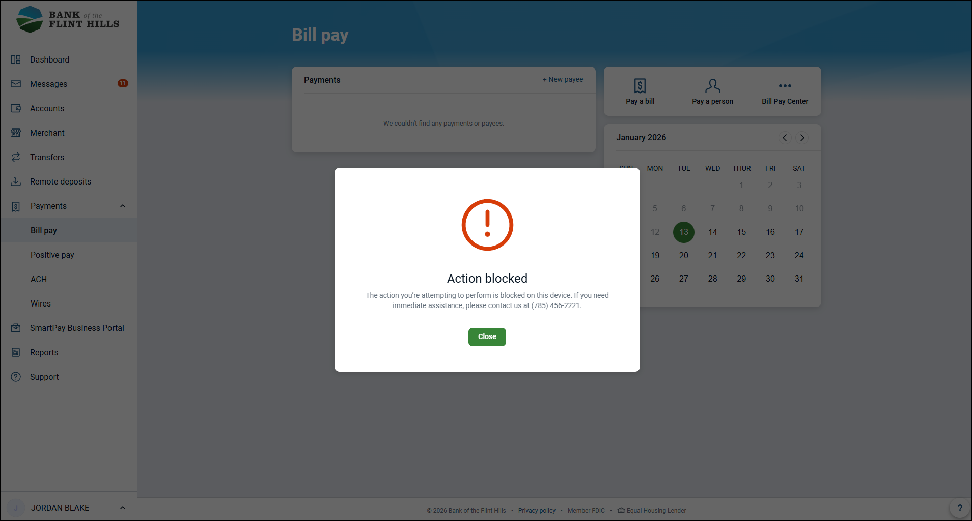 If this is your first time accessing the Bill Pay Center from your device, the action will be blocked as a security measure. You will need to call in to have your device verified by our Customer Support Team before you can access the Bill Pay Center.